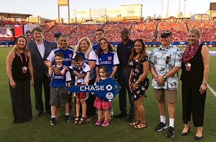 Operation Homefront was honored to join Chase to award a mortgage-free home to dual military family Army veteran Ramiro Carrasco and Marine veteran Aimee Carrasco and their family at an FC Dallas game recently. The family, who has been accepted into Operation Homefront’s Homes on the Homefront program, will receive a newly renovated mortgage-free home donated by Chase.